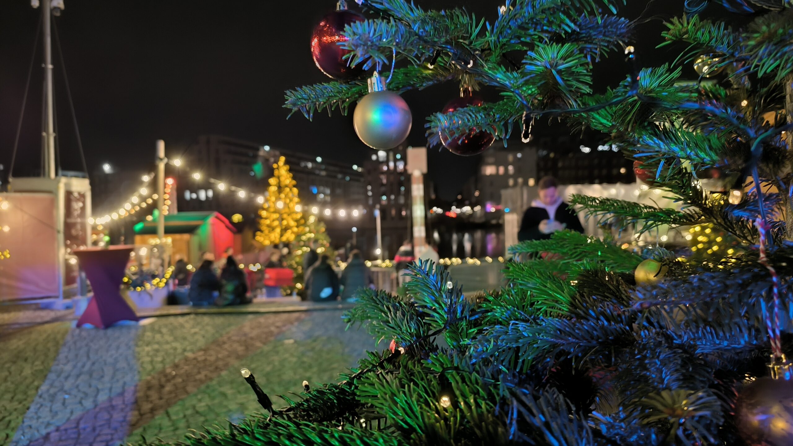 Stoisk z jedzeniem jest kilkanaście. Przy żadnym nie było tłoku (ale przypominam, że to był koniec listopada w środku tygodnia). Na crêpe czekałam może 5 minut. Jest ładna choinka, dekoracje, kilka foto-spotów i stanowisk z grami (m.in. XXL Jenga, bawarski curling, wbijanie gwoździa w pień, siłomierz) . Są zadaszone długie stoły z ławami (najczęściej pozajmowane przez rodziny lub grona znajomych) i mniejsze okrągłe stoliki. Jarmark położony jest bezpośrednio nad rzeką. Są toalety (oczywiście bezpłatne). Cały teren jest ogrodzony. Muzyka nienachalna, ale dzwonek od siłomierza trochę denerwował. Generalnie, kupując zwykły bilet (Weihnachtsmarkt-Besuch) nie masz miejsca, by wejść gdzieś do wnętrza. Weź pod uwagę, że pogoda może być różna, a deszcz nie upoważnia organizatorów do zwrotu biletów. Na placu są ogrzewacze. Część jarmarku zajmuje ogrzewany namiot z ławami, ale o tym dalej.